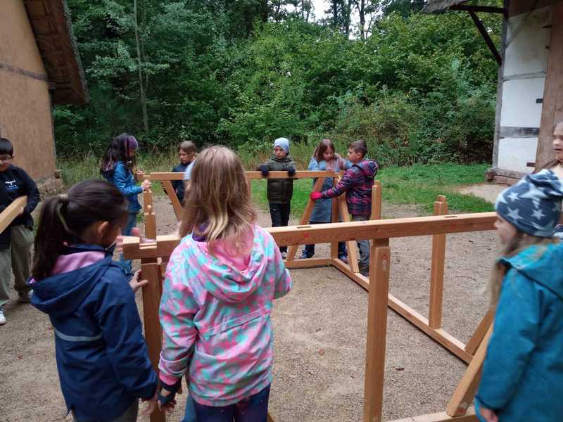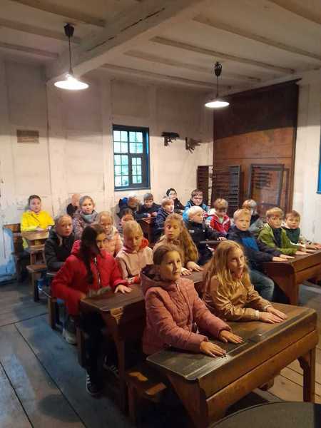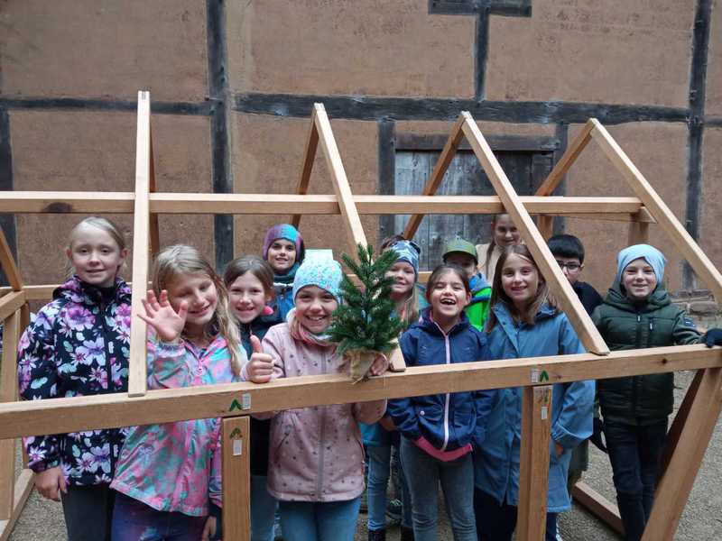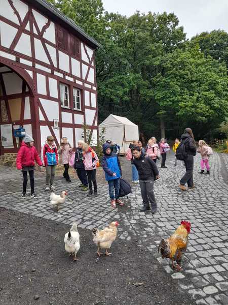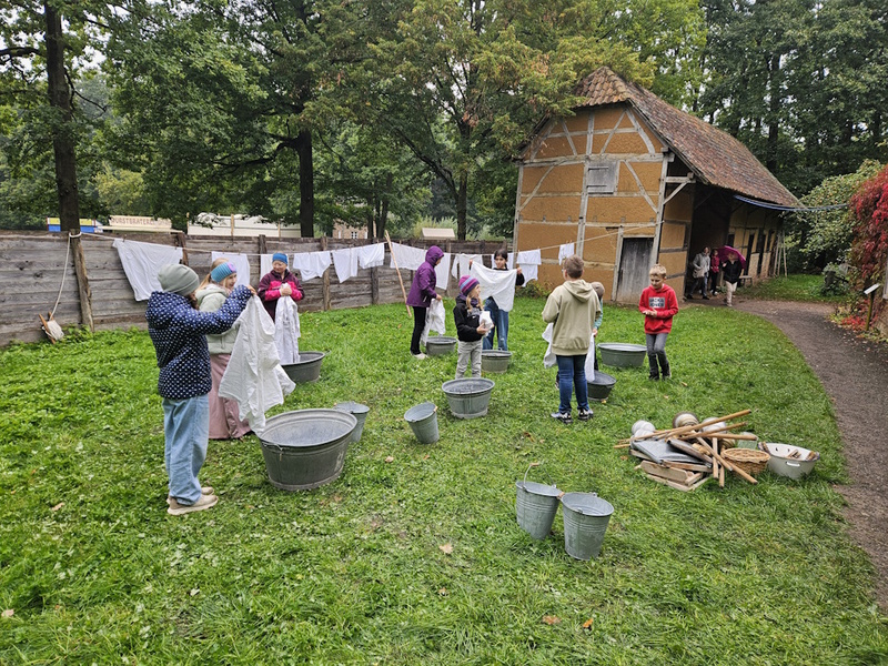 Einen tollen Tag erlebten die Kinder der 4a, 4b und 4d am 25. September 2025. Mit zwei geförderten Reisebussen ging es nach Kommern ins Freilichtmuseum. Während die Wettervorhersage am Vortag noch sehr schlecht aussah, hatten die Kinder am Tag selbst Glück. Zwar war es für einen Septembertag sehr kalt, doch es blieb überwiegend trocken. So konnten alle Klassen die Projekte auch im Freien durchführen. Die 4a erlebte einen Unterrichtstag wie früher in einem alten Schulgebäude, die 4b lernte den Fachwerkbau kennen. Die 4d musste Wäsche wie früher waschen.
